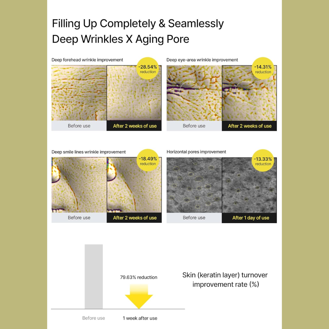 In user trials, 100% of participants reported satisfaction with wrinkle improvement, pore refinement, and enhanced skin elasticity. Clinical results show a 28.54% reduction in deep forehead wrinkles and a 42% improvement in pore tightness in just weeks. The innovative A-Shot™ technology ensures deep absorption without irritation, making it suitable even for sensitive skin types.